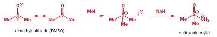 There is a very important class of stabilized sulfur ylids that owe their stability not to an additional anion-stabilizing substituent but to a more anion-stabilizing sulfur group. These are the sulfoxonium ylids, made from dimethylsulfoxide by SN2 substitution with an alkyl halide. Note that the sulfur atom is the nucleophile rather than the oxygen atom in spite of the charge distribution. The high-energy sulfur lone pair is better at SN2 substitution at saturated carbon—a reaction that depends very little on charge attraction.
