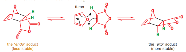 The Diels-Alder reaction of cyclopentadiene with furan can produce two isomeric products. At room temperature, kinetic reaction control prevails and the less stable endo isomer is the main reaction product. At 81 °C and after long reaction times, the chemical equilibrium can assert itself and the thermodynamically more stable exo isomer is formed. The exo product is more stable by virtue of a lower degree of steric congestion, while the endo product is favored by orbital overlap in the transition state.