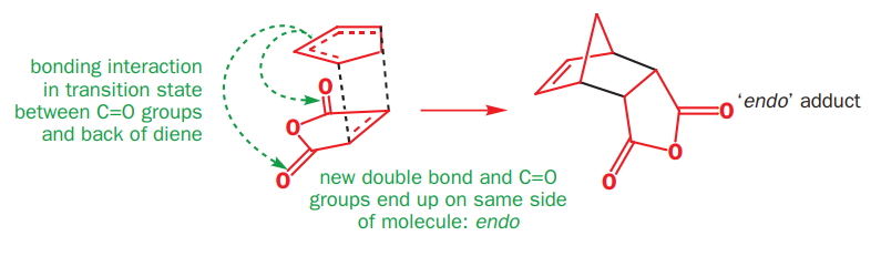 The endo product is less stable than the exo product and yet it is preferred in irreversible Diels–Alder reactions-it must be the kinetic product of the reaction. It is preferred because there is a bonding interaction between the carbonyl groups of the dienophile and the developing π bond at the back of the diene. (The black bonds are the new σ bonds between the two reagents.)