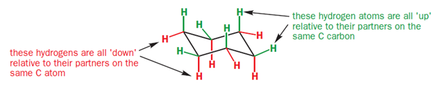 As you go round the ring, notice that each of the CH2 groups has one hydrogen sticking up and one sticking down. However, all the ‘up’ ones alternate between axial and equatorial, as do all the ‘down’ ones.