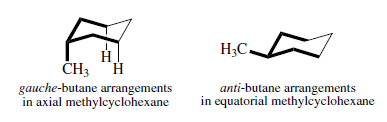 is - 1.8 kcal/mol, corresponding to a composition with 95% of the equatorial methyl conformation. Two factors contribute to the preference for the equatorial conformation. The equatorial methyl conformation corresponds to an anti arrangement with respect to the C(2)-C(3) and C(6)-C(5) bonds, whereas the axial methyl group is in a gauche relationship to these bonds. Gauche conformation of n-butane is 0.8 kcal/mol higher in energy than the anti conformation. In addition, there is a Vander Waals repulsion between the axial methyl group and the axial hydrogens at C-3 and C-5. Interactions of this type are called 1,3-diaxial interactions.