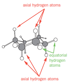In the chair conformation of cyclohexane, all six carbon atoms are identical, but there are two types of protons-one type stick either vertically up or down and are called axial hydrogen atoms; the other sort stick out sideways and are called equatorial hydrogen atoms.