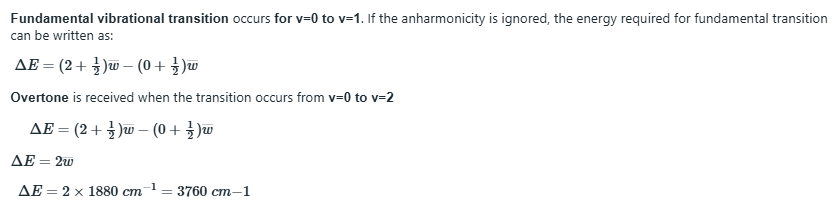 , etc., are also observed in the IR spectra. These are called the first overtone, the second overtone, etc., respectively. The intensity of an overtone is dependent on the anharmonicity of the vibration. Compared with the highly intense fundamental vibrational frequency, the overtones are very weak, i.e., of considerably low intensity.