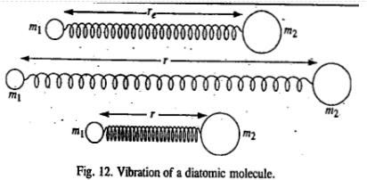 In the case of a diatomic molecule, the masses m1 and m2 vibrate back and forth relative to their centre of mass in opposite directions