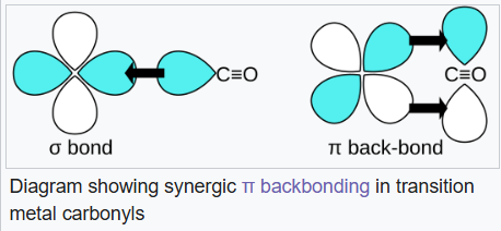 Option a:Carbon monoxide bonds to transition metals using "synergistic pi* back-bonding". The M–C bonding has three components, giving rise to a partial triple bond. A sigma (σ) bond arises from overlap of the nonbonding (or weakly anti-bonding) sp-hybridized electron pair on carbon with a blend of d-, s-, and p-orbitals on the metal. A pair of pi (π) bonds arises from overlap of filled d-orbitals on the metal with a pair of π*-antibonding orbitals projecting from the carbon atom of the CO. The latter kind of binding requires that the metal have d-electrons, and that the metal be in a relatively low oxidation state (0 or +1) which makes the back-donation of electron density favorable. As electrons from the metal fill the π-antibonding orbital of CO, they weaken the carbon–oxygen bond compared with free carbon monoxide, while the metal–carbon bond is strengthened. Because of the multiple bond character of the M–CO linkage, the distance between the metal and carbon atom is relatively short, often less than 1.8 Å, about 0.2 Å shorter than a metal–alkyl bond.