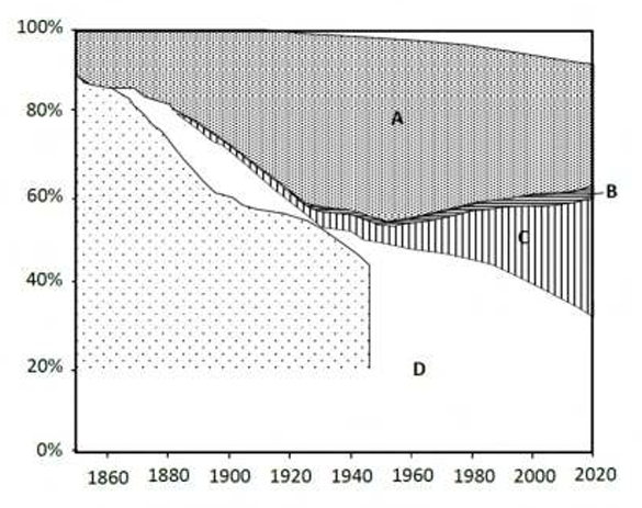 - D (Europe) has a significant but declining share of emissions, particularly after 1950, consistent with Europe’s reduction in coal and other fossil fuels use and its shift towards cleaner energy sources.