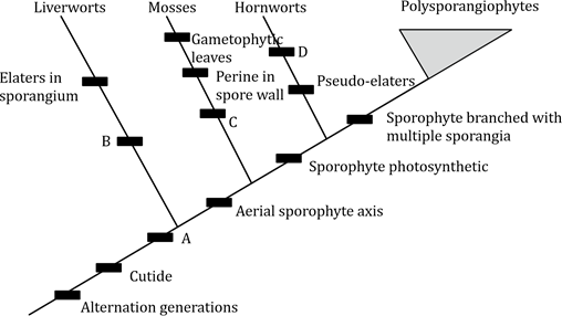 A. Cuticle: The cuticle is a waxy layer that helps prevent water loss in plants, which is a key feature for terrestrial adaptation. This corresponds to apomorphy (iii): Morphological changes that take place with plant development. The cuticle is an important adaptation for plant survival on land, which is why it is linked to morphological development in plants.