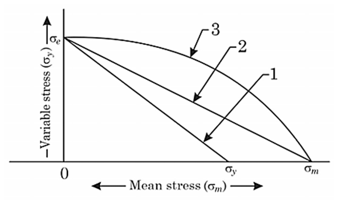 Goodman Line:This is the most widely used criterion for fatigue failure undermean stress (σm) and variable stress (σv).It is given by the equation:σeσv+σuσm=1Where:σv=Variable stress amplitudeσm=Mean stressσe=Endurance limit (fully reversed stress)σu=Ultimate tensile strength