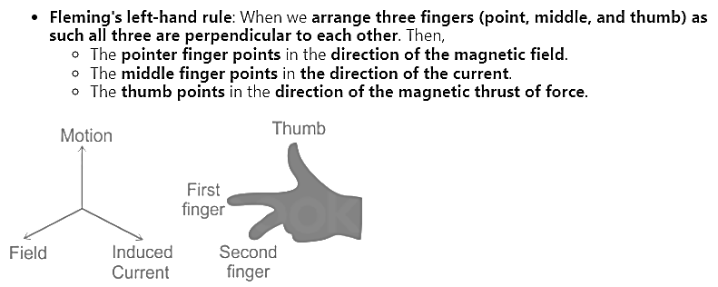 In this rule, the three fingers (thumb, pointer, and middle) are arranged at right angles to each other. This rule is primarily applied in electric motors to predict the direction of motion resulting from electromagnetic forces.