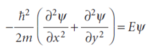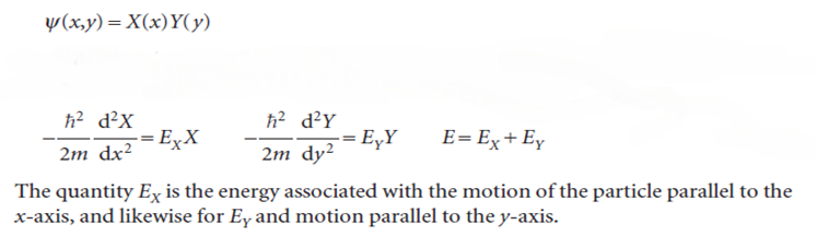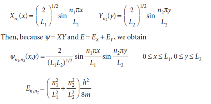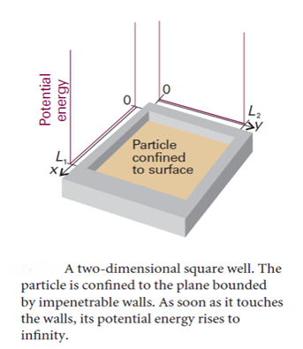 A particle is confined to a rectangular surface of length L1 in the x-direction and L2 in the y-direction; the potential energy is zero everywhere except at the walls, where it is infinite. The wavefunction is now a function of both x and y and the Schrödinger equation is