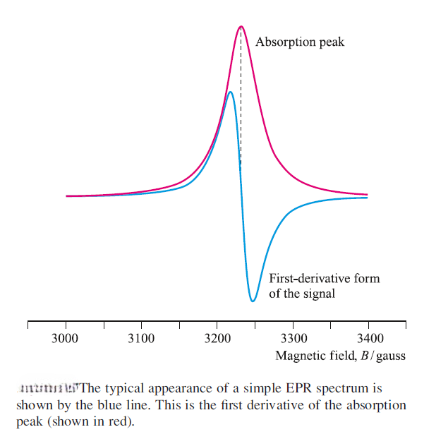 The form in which an EPR spectrum is recorded is the first derivative of an absorption peak, because in this form the detection is more sensitive and the signal : noise ratio is improved due to intrinsic electronic properties resulting from modulation of the magnetic field. The point at which the derivative curve is zero (i.e. crosses the baseline) corresponds to the absorption maximum, and the magnetic field, Bsample , at this