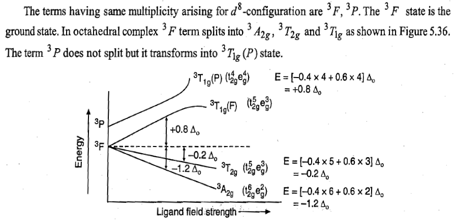 In d8 octahedral complexes, the d-orbitals split into t2g (lower energy) and eg (higher energy) orbitals. Thus, in ground state the electronic configuration is