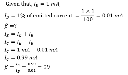 The emitter current of a transistor is 1 mA. If 1% of the emitted current carriers are lost in the base recombination, what is the value β?