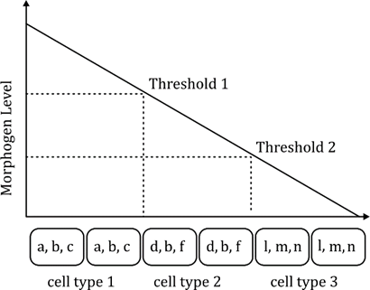 Cell type 1 (high morphogen levels): expresses genes a, b, c