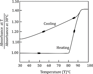 Heating curve: As temperature increases, DNA denatures → Absorbance increases.