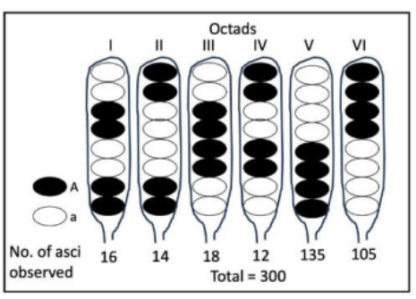 The figure displays the different types of octads, which correspond to the various patterns of allele segregation between the haploid strains of Neurospora crassa. The numbers of asci (spore sacs) are shown for each pattern. The total number of asci observed is 300.