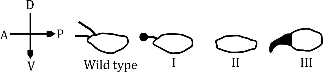 Mutant II: This mutant shows a disruption in the curvature of the embryo, suggesting a problem with dorsal-ventral patterning. This is most consistent with a gurken loss-of-function phenotype. gurken mutants often show a reduction in dorsal structures and an expansion of ventral structures. The image, while not perfectly clear, suggests a less pronounced dorsal side, aligning with this.