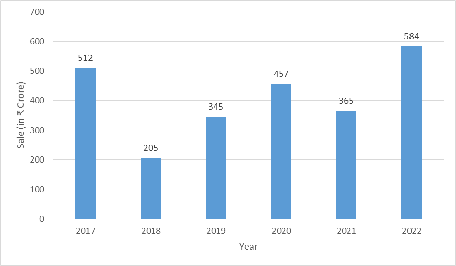 The following bar graph shows the sales of a company (in ₹ crore) in different years. Study the graph and answer the question.