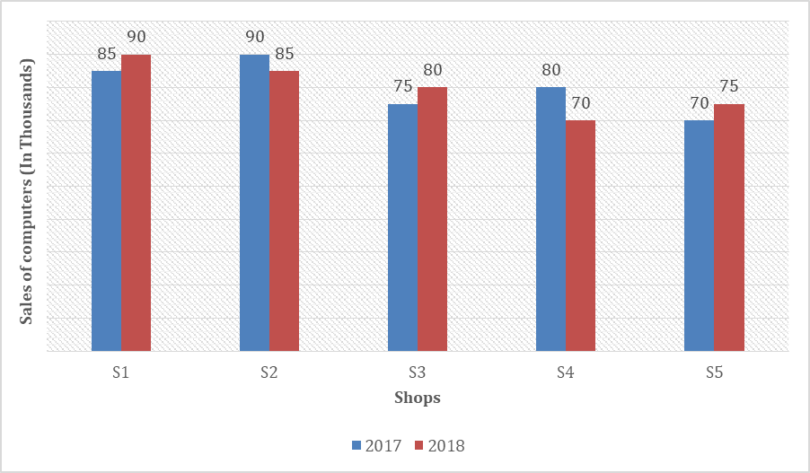 The following bar graph shows the sales of a computer (in thousands) from five different shops, S1, S2, S3, S4 and S5, in 2017 and 2018. Based on the bar graph answer the question given below.