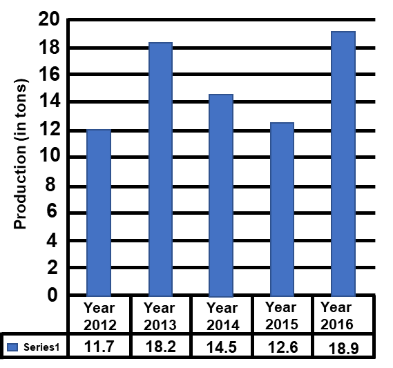 Increase in production from 2015 to 2016 = 18.9- 12.6 = 6.3tons