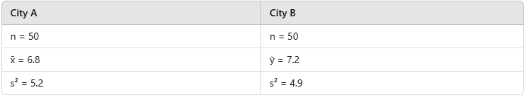 · The sample sizes for City A and City B are independent (n = 50 each).