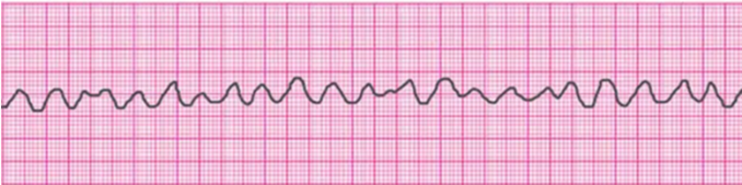 The ECG shown has a chaotic, irregular waveform with no discernible QRS complexes, P waves, or T waves. This is characteristic of ventricular fibrillation, a life-threatening arrhythmia where the ventricles quiver ineffectively. It results in immediate loss of cardiac output and requires urgent defibrillation.