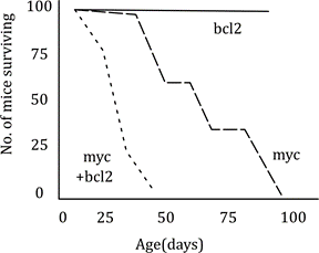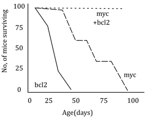The combination of Myc + Bcl2 results in an even faster decrease in survival, suggesting Myc + Bcl2 causes lymphoma at the most rapid rate, which is what we expect with this genetic synergy.