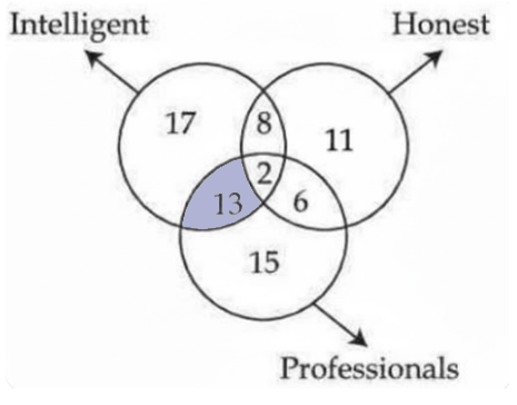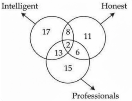 The following figure consists of three intersecting circles, each representing a group of persons who are Honest, Intelligent and Professionals.