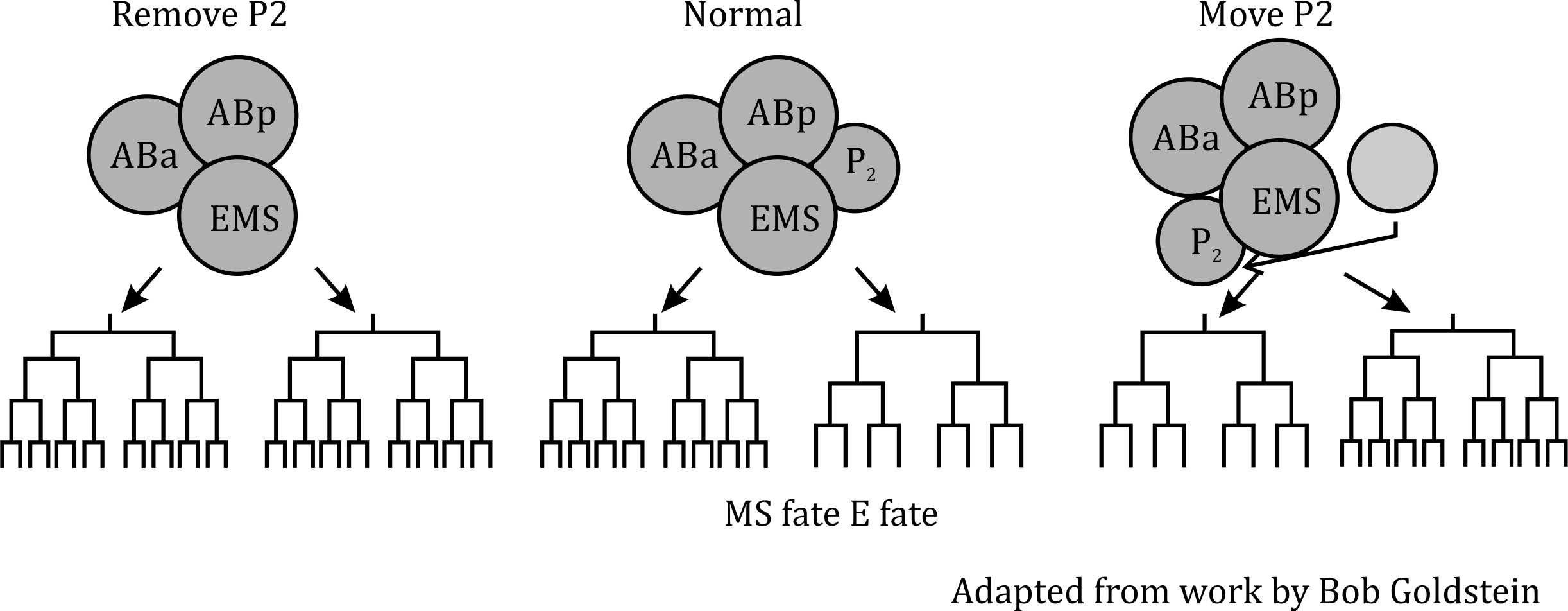 - If P2 is removed or misplaced, the EMS cell does not generate E cells, demonstrating conditional specification.