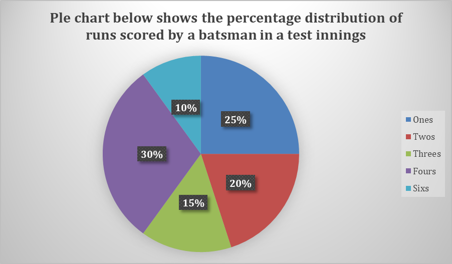 The following Pie chart shows the percentage distribution of runs scored by a batsman in a test innings.