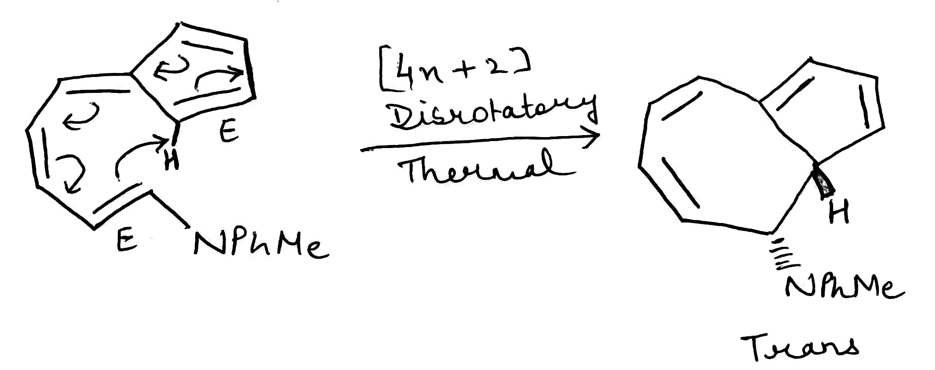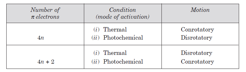 Depending on the type of reaction (photochemical or thermal) and the number of pi electrons, the reaction can happen through either a conrotatory or disrotatory mechanism.