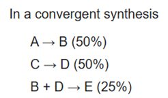 the overall yield of E (25%) looks much better. Convergent synthesis is applied in the synthesis of complex molecules and involves fragment coupling and independent synthesis. This technique is more useful if the compound is large and symmetric, where at least two aspects of the molecule can be formed separately and still come together.