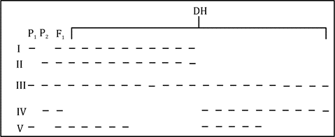 - Bands II and V show different segregation patterns in the DH progeny. Band II is present in some DH lines and absent in others, while band V shows a separate pattern of presence and absence, with no consistent linkage between the two. This suggests that the loci for bands II and V are on different chromosomes or far apart on the same chromosome, leading to independent assortment. This statement is correct.