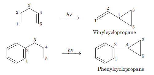 The most remarkable photochemical reaction of nonconjugated dienes is the di-π-methane rearrangement. This rearrangement is given by dienes having π (pi) system separated by an sp3 hybridized carbon atom i.e., 1, 4-pentadienes. Irradiation of the substrate induces rearrangement to a vinylcyclopropane or phenylcyclopropane derivative.