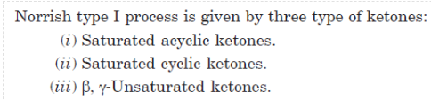 The Norrish type I reaction is the photochemical cleavage or homolysis of aldehydes and ketones into two free radical intermediates (α-scission). The carbonyl group accepts a photon and is excited to a photochemical singlet state. Through intersystem crossing the triplet state can be obtained. On cleavage of the α-carbon bond from either state, two radical fragments are obtained. The size and nature of these fragments depends upon the stability of the generated radicals.