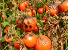 Dark, water-soaked lesions appear on leaves, stems, and fruits, causing extensive damage.