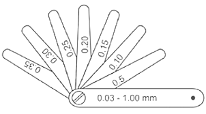 small gaps or clearances between two matching parts. It consists of a set of thin metal blades of various thicknesses, marked with their precise thickness values. By inserting different blades or combinations of blades into the gap, the clearance can be accurately determined. Feeler gauges are commonly used for checking valve clearances, spark plug gaps, and alignment in machinery.