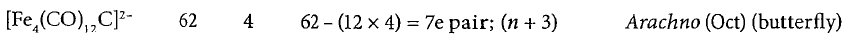 The TEC in the cluster has the contribution from (i) the number of valence electrons of each metal, (ii) 2e for each CO group irrespective of its bonding, terminal or bridged, (iii) le for each negative charge and (d) number of valence electrons for each hetero atom and/ or interstitial atom, for example, 1 for H, 4 for C, 5 for N and so on. The polyhedral electron count (PEC) is calculated as follows: