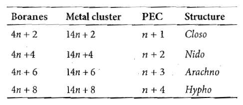 If a non-transition element is present on the vertex, then subtract 2e per element instead of 12e. Once we have the TEC and PEC, then, on the basis that n + 1 pairs of electrons are required for a polyhedron with n vertices (or alternatively, the number of vertices of the parent polyhedron is one less than the PEC), the most likely structure may be selected.