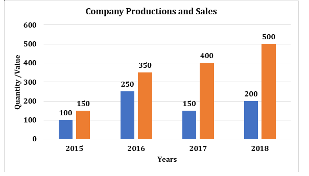 The bar graph illustrates a company’s production (in lakhs) and sales (in crores) over a span of four years from 2015 to 2018. The blue bars represent sales figures, while the orange bars indicate the company’s production levels. Answer the questions below based on this graph.