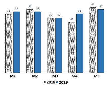 Average production of M1, M2 and M3 in 2019 is equal to average production of M1, M2 and M3 in 2018.Option D is false.