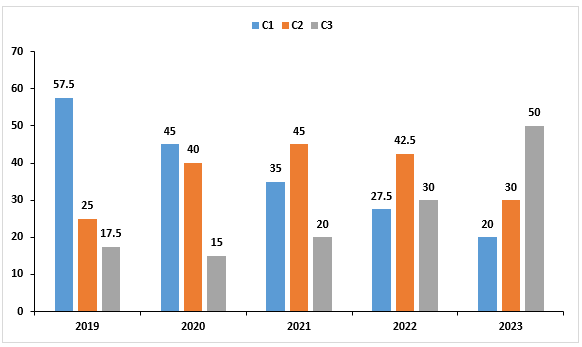 The percentage of production of three companies C1, C2 and C3 over five years