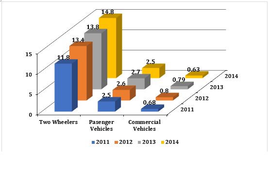 Increase in production of automobiles from year 2011 to 2014