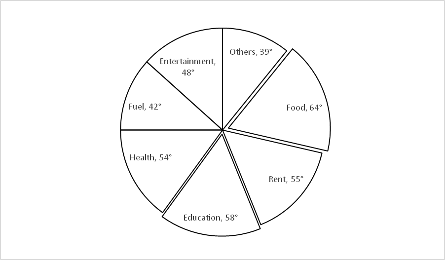 The amount spent on food and education during a month = 58° + 64° = 122°