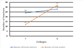 The given line graph depicts the number of teachers (male and female) in two colleges