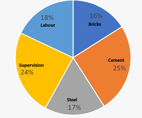 If the total cost of construction is ₹9,00,000, by how much does the amount spent on cement exceed the amount spent on labour?