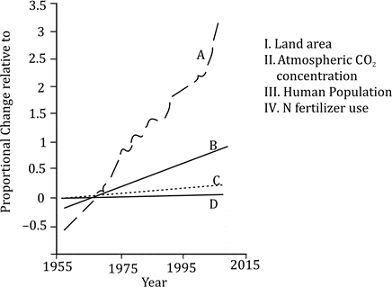 Candidate causes: N fertilizer use (post-1950s Green Revolution)