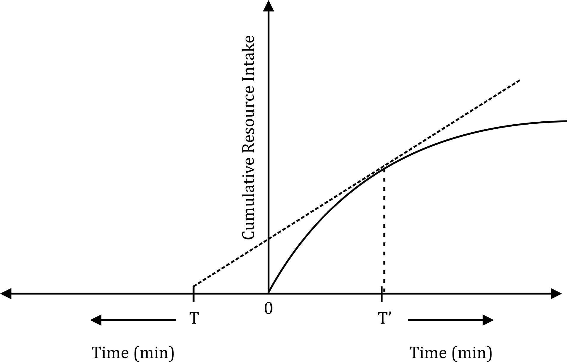 - The Y-axis represents cumulative resource intake, which follows a diminishing returns curve.