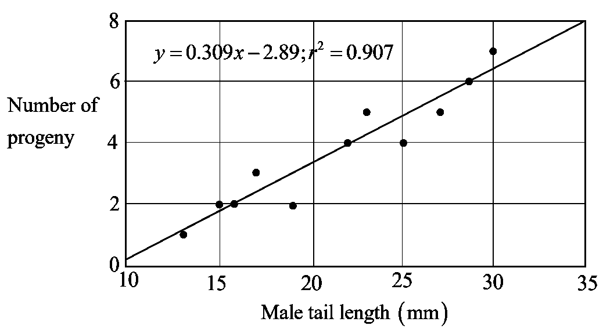 The regression line y=0.309x−2.89y = 0.309x - 2.89y=0.309x−2.89 indicates a positive correlation between male tail length (in mm) and the number of progeny. As the male tail length increases, the number of progeny also tends to increase.Strength of Relationship: