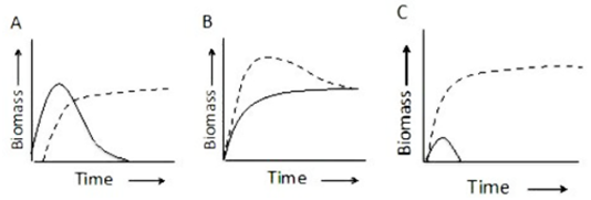Graph A: One species (solid line) increases in biomass early, then declines. Another species (dashed line) rises after that and persists.